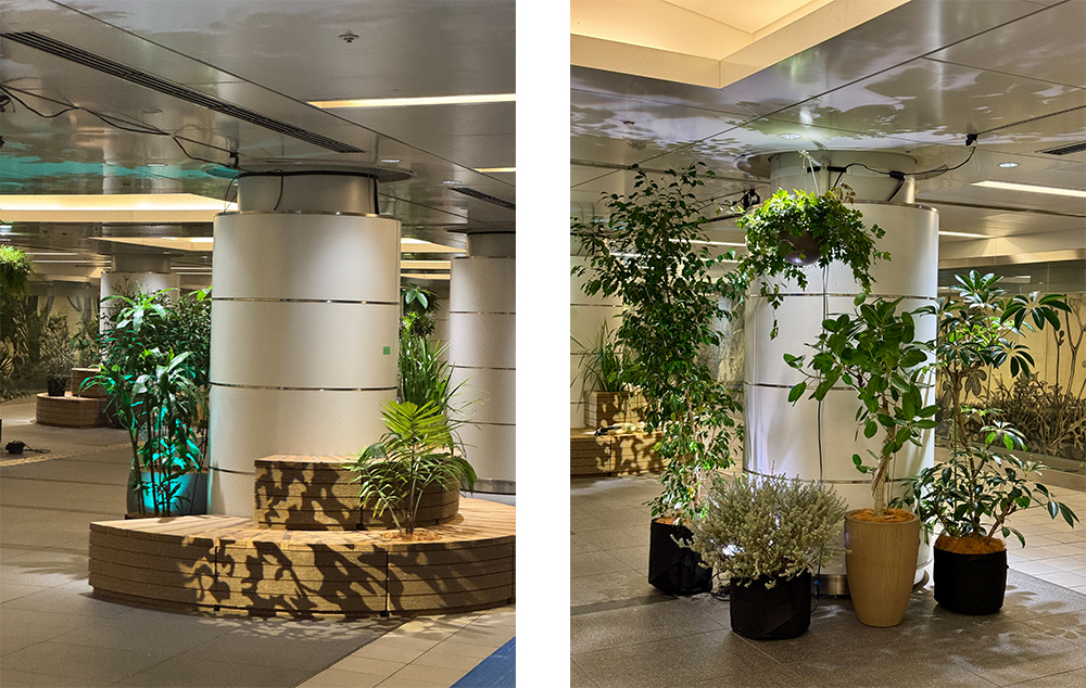 また、大中小のプランター植物やハンギングプランツ以外にも、リサイクル可能な段ボール製ベンチや植物育成補助照明の導入により、単なる装飾ではなく、滞在性向上・環境配慮・効果検証を兼ねた広義の「グリーン」空間が目指されています。豊かな緑に覆われつつも、その隙間から「誰か」を感じることのできる空間は、忙しない日々の中で安心して深呼吸することができる新しいオープンスペースとして機能しています。